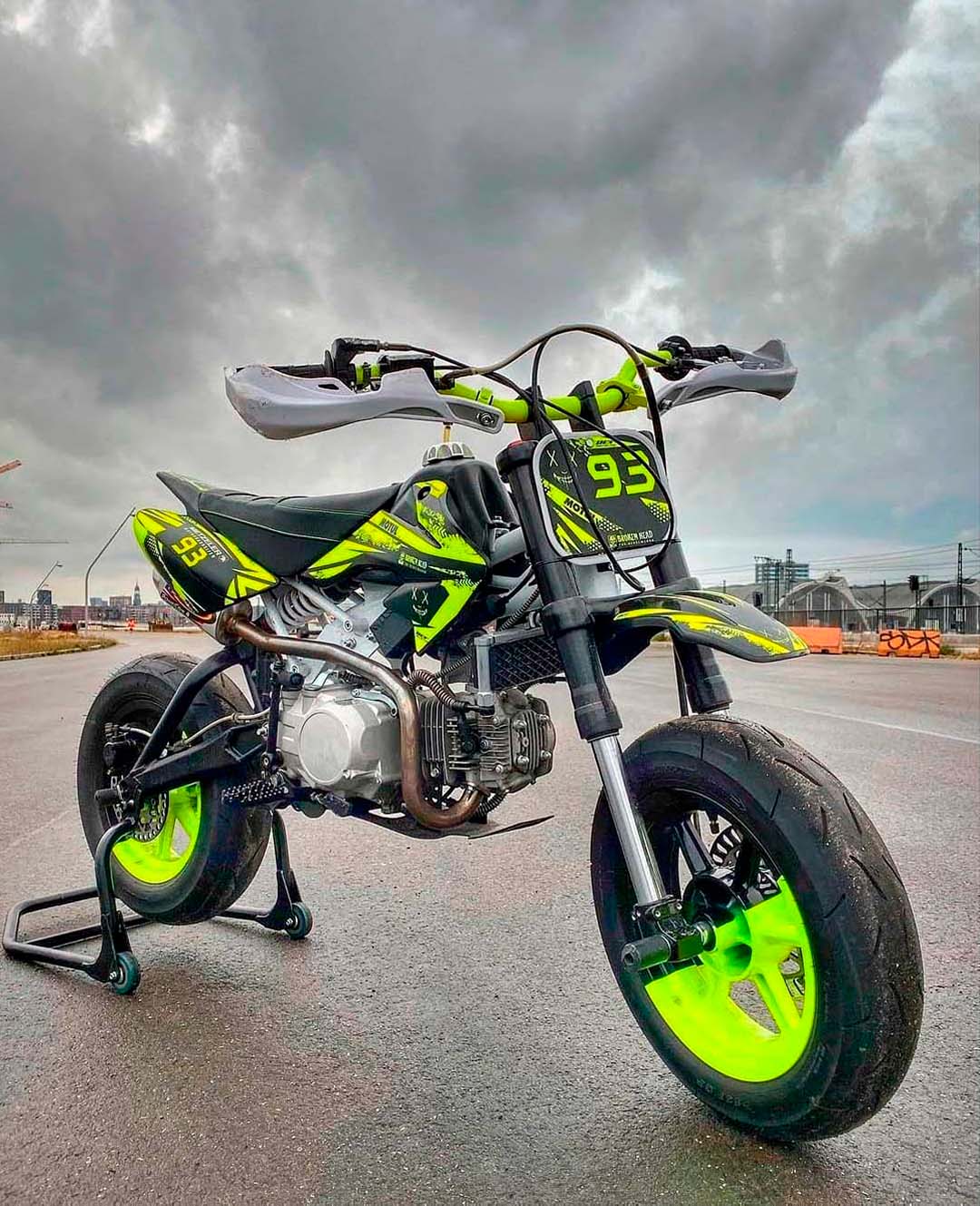 Ruedas y neumáticos: Las Pit Bikes motard están equipadas con llantas de menor diámetro y neumáticos de asfalto de alto rendimiento. Estas ruedas proporcionan un mejor agarre en superficies pavimentadas y permiten maniobrar con mayor precisión en curvas y cambios de dirección.
