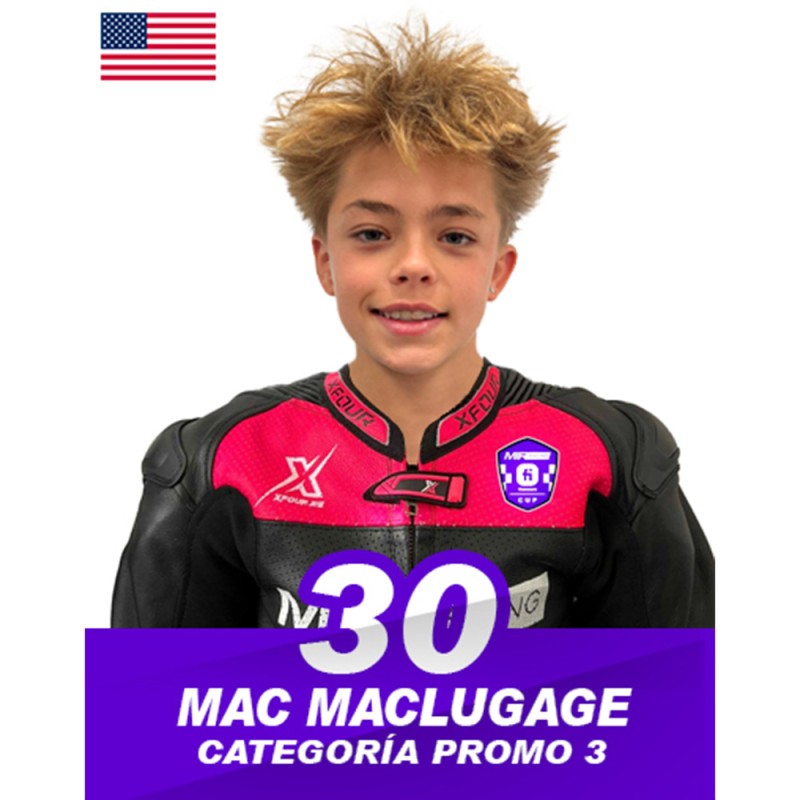 Mac Maclugage es un piloto procedente de Estados Unidos que se incorpora esta temporada a la categoría Promo3 de la MIR Racing Cup, donde ha realizado un sólido recorrido en las categorías inferiores del campeonato. En 2024 compitió en Moto5, donde finalizó en 13ª posición, mostrando una evolución constante a lo largo del año. En 2023 ya había dejado buenas sensaciones al terminar en 7ª posición en la general de GP10, consolidándose como un piloto competitivo y con gran proyección internacional.